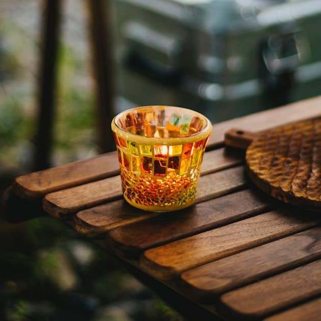 色ガラスをあしらったキャンドルグラスは、灯すとクリスタルのような光が揺らめき、自然の風景に溶け込む彩を添えます。