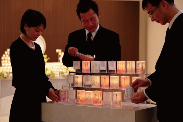 ご葬儀や、お別れ会にて、メッセージ献灯でのご使用が可能です。参列された方が、それぞれの想いをメッセージシートに綴ります。ひとりひとりが灯すローソクのあかりは、メッセージとともに亡き人をあたたかく包み込みます。想いの込められたメッセージシートは、お別れの際、柩に献げます。